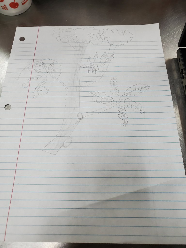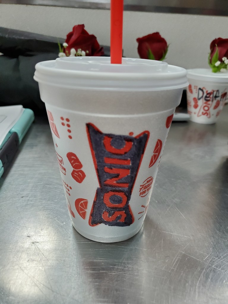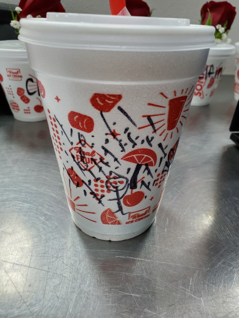 2. Yes it was very fun to spend time to draw these in order to distress from other major courses. Yes, it was frustrating because it is hard to get the most consistent piece of art. You expect it to be the best piece of art; yet, in reality, it looks a lot different. Yes, I will try again someday whenever I am available. The best way that I drew these the two trees and two people was to apply my past art skills as well as to draw as I look, so that way I can concentrate. What I drew on my Sonic Cup, was a rainy day. The way that I did it was to represent the drink as the sun, the tater tots as the clouds which is going to rain. I also drew a stick figure, as well as a stick extending the lime wedge to represent it as an umbrella. So, the whole drink art was a person holding an umbrella on a rainy day. The second way was to have a dark theme for sonic’s logo.
